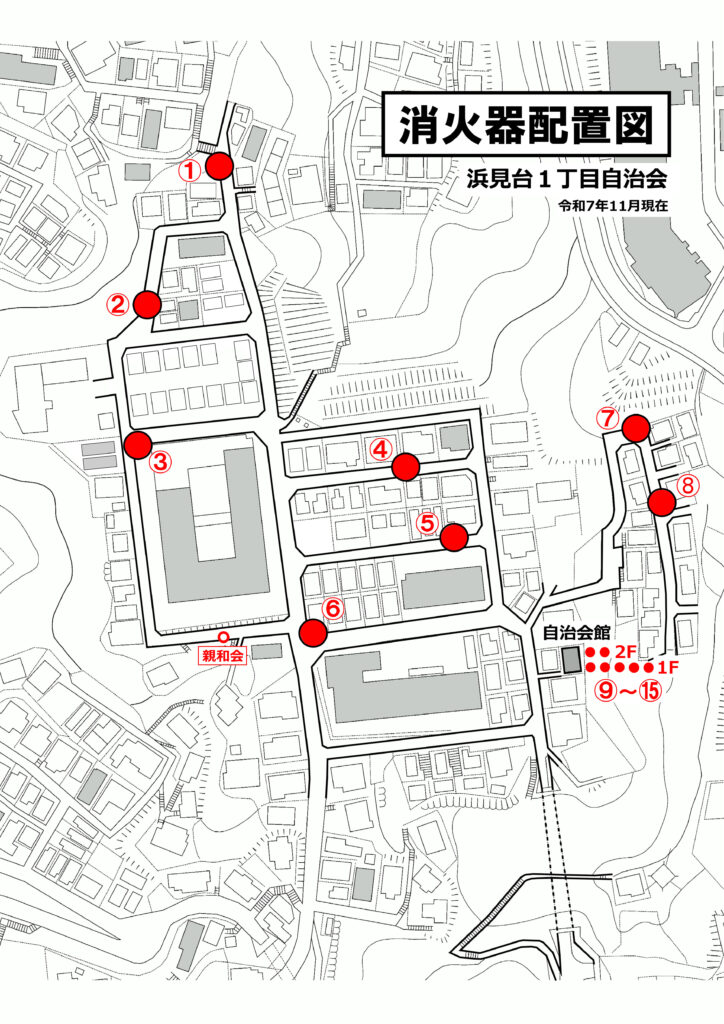 自治会区域の消火器配置です。消火器ボックスに入っています。