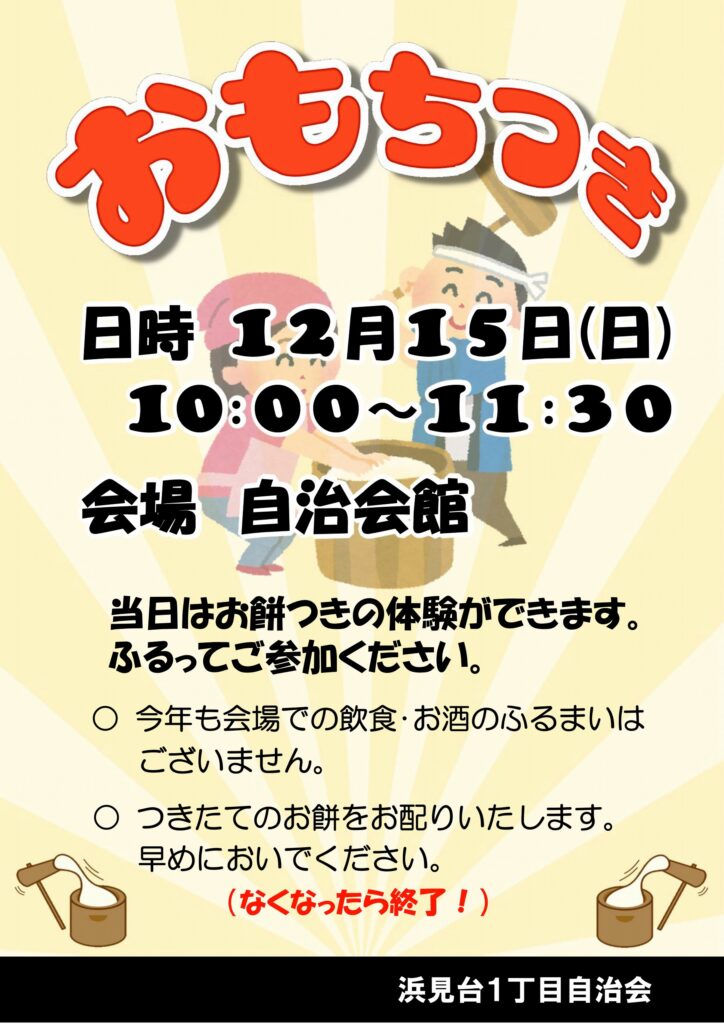 12月15日(日)に開催しました「おもちつき」に多くの方がおいでいただき、おもちつきの体験もたくさんの方に行っていただきました。ついたお餅は皆さんにお持ち帰りいただきました。つきたてのお餅の味はいかがだったでしょう。